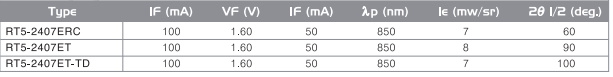 * 5 Ø, 2θ1/2 : 90° , λp: 850 nm , Ie : 8.3 mW/sr @ 50mA