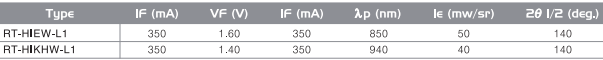 * 2θ1/2 : 140° , λp: 855 nm , Ie : 50 mW/sr @ 350mA